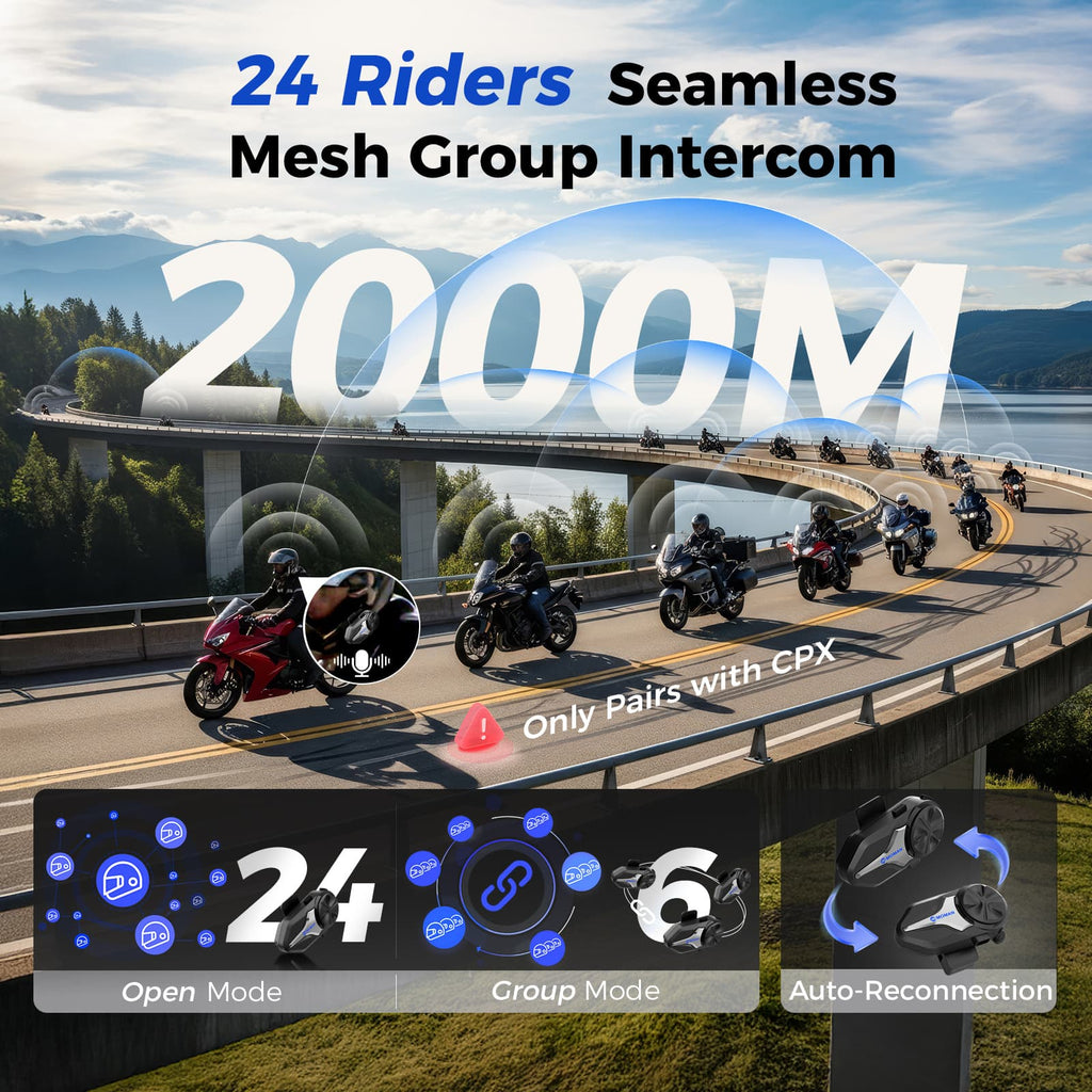 Powered by Mesh and Bluetooth 5.3 technology, the CP-X maintains a stable intercom connection up to 2000 meters (LOS), even in challenging terrains. The system intelligently adapts to obstacles or signal drops with automatic reconnection, ensuring every rider remains linked in real time.