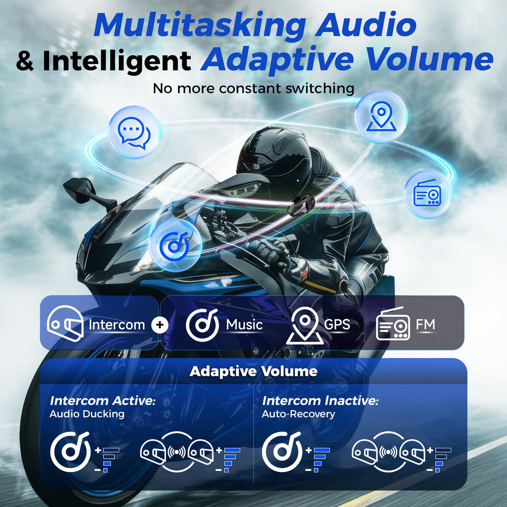 Equipped with 40mm Hi-Fi speakers and professionally tuned audio profiles, this motorcycle helmet mesh intercom delivers deep bass, rich mids, and crisp highs for a truly immersive audio experience. Every note and voice comes through with clarity and precision, whether you’re listening to music, navigation, or intercom chats.